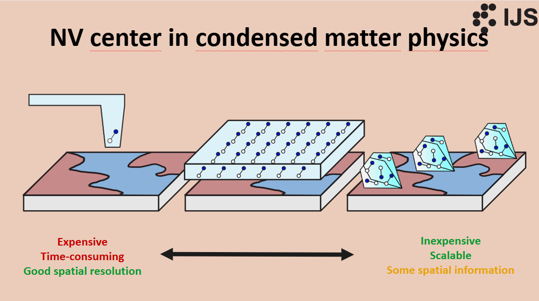 Dr Izidor Benedičič from the Jožef Stefan Institute explains another aspect: NV centres in nanodiamonds can act as local probes for condensed-matter physics. There are several reasons why nitrogen vacancy (NV) centres have become so popular among physicists for fundamental research into the microscopic magnetic properties of materials.